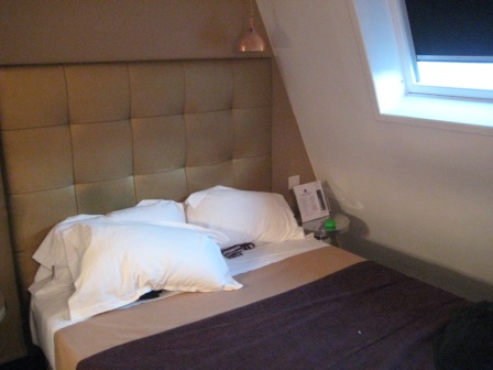 Be’ quasi tutto e’ andato come previsto, la posizione dell’albergo e’ l’ideale per chi vuole girare la citta’ vicino ad una delle piu’ importanti stazioni del metro’ e quindi comodissima per ogni tipo di collegamento; arredamento moderno ed elegante, struttura da poco inaugurata e quindi nuova e pulita; la camera?…non piccola ma la piu’ piccola che io abbia mai visto nella mia vita, davvero spazi ridotti al minimissimo, con letto alla francese (per intenderci poco piu’ piccolo di una piazza e mezzo) schermo piatto che si discosta di qualche centimetro dal muro, quanto basta per sbatterci la schiena ogni volta che fai un passo.