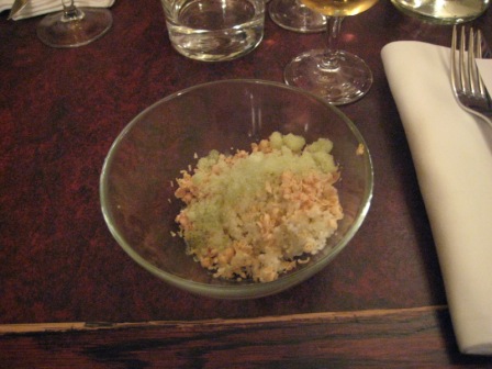 Amuse bouche: servito in una coppa di vetro, del cavolfiore crudo tritato, con granita di sedano e lamelle di foie gras, fresco e stuzzicante come inizio .