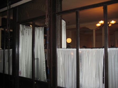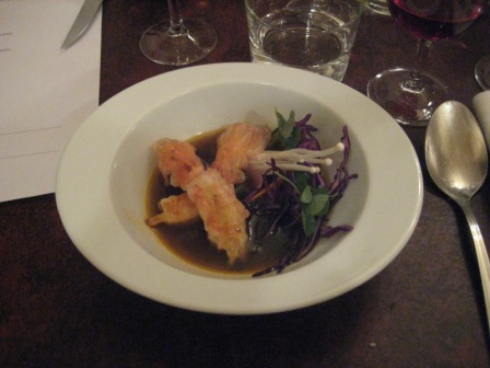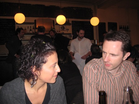 Il locale e’ stracolmo di gende, incastrata tra i piccoli tavolini, disposti uno accanto all’altro, eliminando quindi qualsiasi tipo di privacy; l’atmosfera e’ comunque carina, l’arredamento e’ rustico da classico bistrot, un bel bancone all’ingresso (affollato di gente che aspetta il suo turno), la cucina e’ quasi a vista e proprio all’ingresso di questa c’e’ un piccolissimo bagno riservato al publico (cosa che per le leggi italiane sarebbe impossibile).