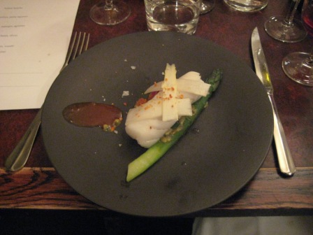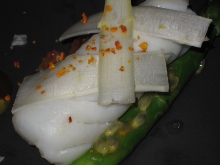 siamo alla terza portata, Merluzzo con asparagi bianchi e verdi con agrumi e salsa di arance, davvero molto buono ed equilibrato.