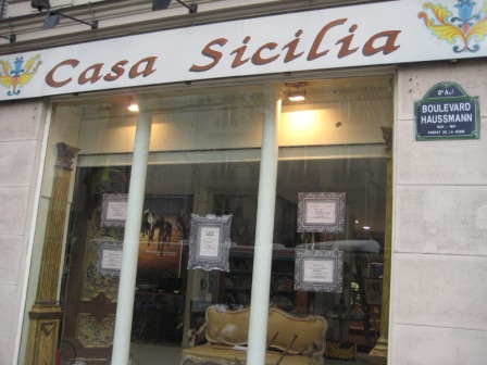 Quella che vedete sopra e’ l’insegna di “Casa Sicilia”, importante e caratteristico negozio che, in una delle vie piu’ trafficate di Parigi, espone i nostri prodotti tradizionali, dai mobili ai vasi di Caltagirone ai pupi Siciliani.