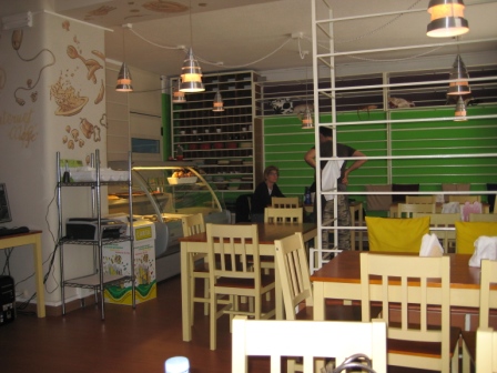 L’ambiente e’ luminoso ed informale, il verde acceso delle pareti ed il color legno dei tavolini, danno un tocco di modernita’.