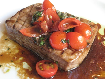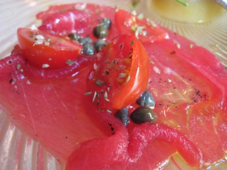 Un battuto di tonno, con capperi e pomodorini di Pachino;