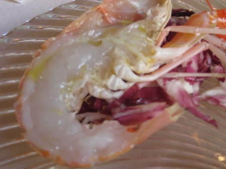 L’ottimo impatto estetico viene da subito implementato da un piacevolissimo odore di pesce fresco ed erbe aromatiche…la bellissima trasparenza dello scampo lascia presagire un gusto intenso ed una carne soda e compatta, a vederlo sembra quasi vivo…ma….non sembra…e’ vivo!!!