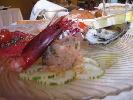 proseguiamo con un interessante tartar di salmone accompagnata da piacevolissimi cubetti di cetriolo ed un gambero rosso.