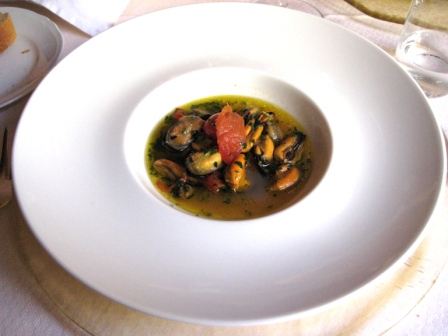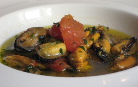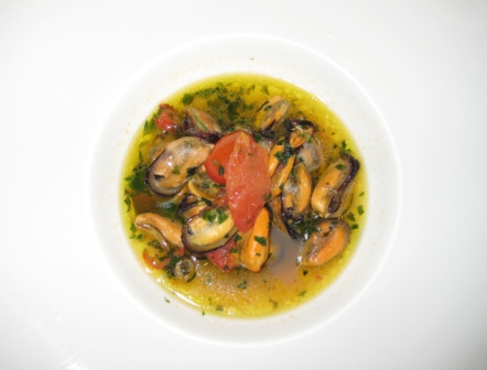 La zuppa di cozze, piatto tipico di queste zone, ma in questo caso in una versione riveduta e corretta.