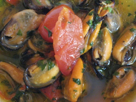 Le cozze, sgusciate e cotte in una interessante zuppa ravvivata dai pomodorini e dal prezzemolo ed esaltata anche in questo caso dall’ottimo e forte peperoncino fresco.