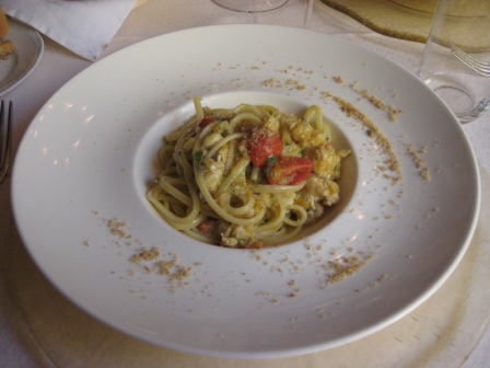 Rientrati, troviamo subito una bella sorpresa; linguine all’aragosta, con pomodorini, finocchietto selvatico e mollica abbrustolita.