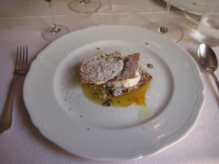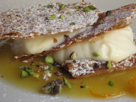 Siamo al Dolce…un Sicilianissimo millefoglie alla ricotta, con pistacchi ed agrumi canditi, in abbinamento con una azzeccatissima salsa di mele…classico ma davvero squisito.