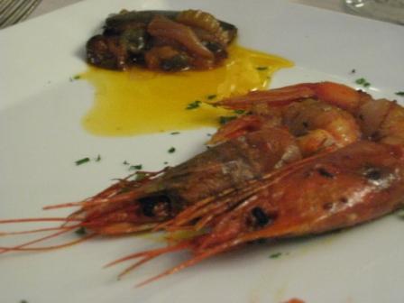 Ultimo piatto del menu’: gamberoni al lardo, con caponata.