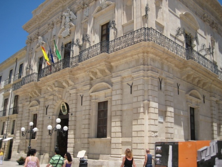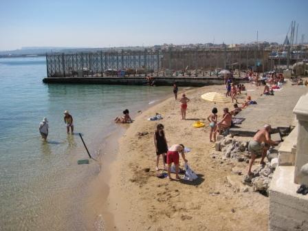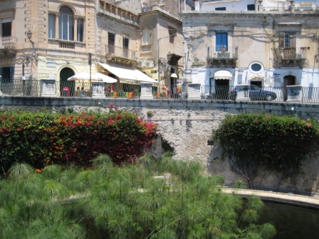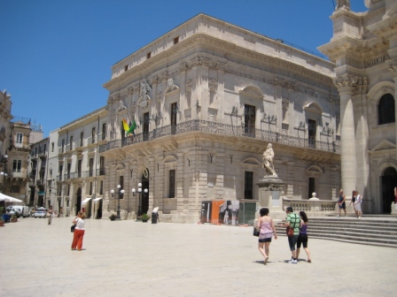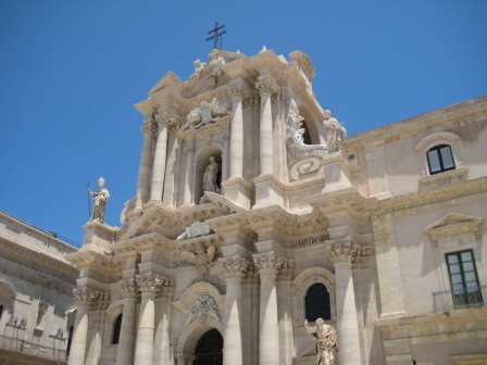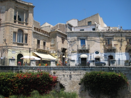 Costeggiamo il mare, il sole picchia forte e la pietra bianca che riflette la luce, accentua la sensazione di calore; i turisti ( beati loro, si immergono nelle azzurre acque Aretusee…).e noi….boccheggiando ci avviamo per i vicoli della splendida Ortigia.