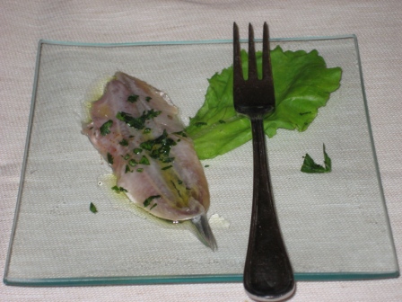 Piccolo assaggio di benvenuto: Alice leggermente marinata con olio extravergine, limone e prezzemolo.