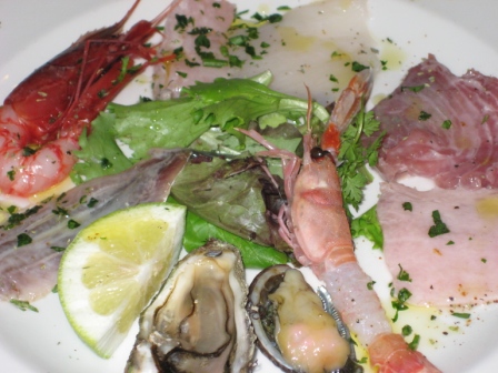 in ordine dentice, pescatrice, tonno e pesce spada leggermente marinati, uno scampo, un ottimo occhio di bue, una piccola ostrica, ed il gambero rosso, oltre all’alice marinata, che gia’ avevamo assaggiato un attimo prima.
