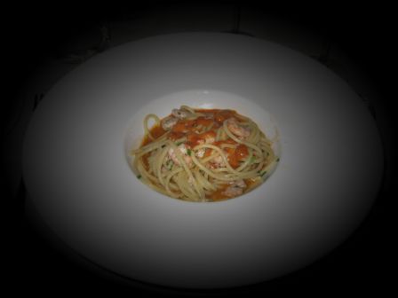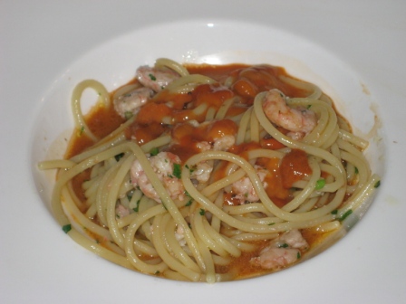 Torniamo a noi: su un bel piatto bianco spiccano i nostri spaghetti con gamberetti e polpa di ricci.