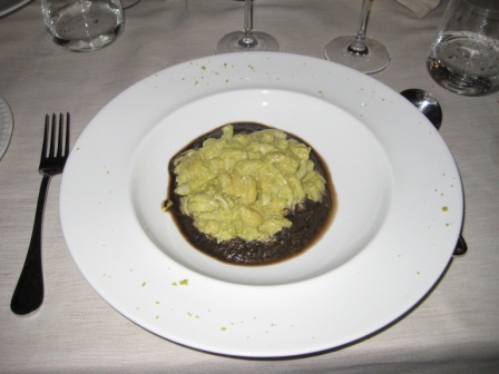 Piatto successivo: cavatelli alle seppie, con pistacchio di Bronte e nero di seppie.