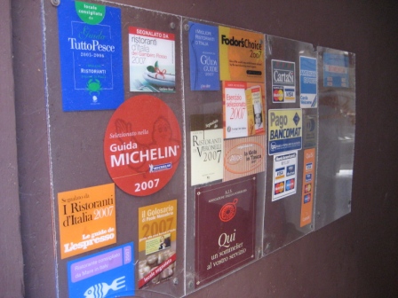 All’ingresso del locale, fanno bella mostra i classici e sempre ambiti adesivi delle varie guide.