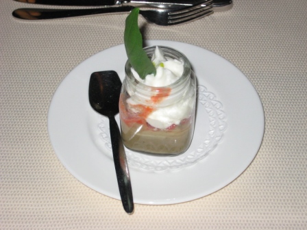 Primo assaggio, un simpatico barattolino, nasconde al suo interno una rivisitazione di parmigiana, composta da una crema di melanzane, pomodori confit, spuma di parmigiano e l’immancabile basilico.