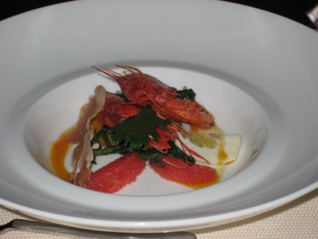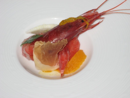 Ecco il primo piatto di una certa consistenza, gambero rosso crudo, con agrumi, speak artigianale e finocchietto selvatico;