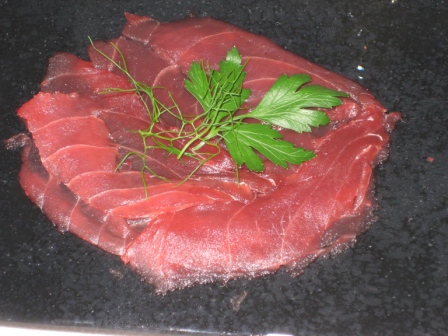 Proseguiamo con un crudo di tonno, servito su di una bella piastra nera con prezzemolo e finocchietto;