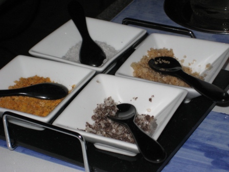 ad accompagnare il crudo, dell’ottimo olio extravergine di oliva ed una intrigante selezione di Sali marini: il tradizionale integrale, lo speziato, il classico affumicato e l’ottimo vanigliato.