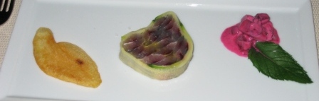 Proseguiamo il nostro percorso con un altro piatto parecchio invitante, Terrina di alici con zucchine, accompagnata da una salsa di barbabietola ed una semplice chips a completare la costruzione estetica del piatto.