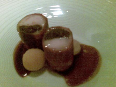 Stiamo quasi per finire la cena ma ad un tratto arriva il penultimo piatto composto da filetto di coniglio avvolto da jambon iberico e palline di patate, all’interno dell’involtino troviamo una crema alle olive nere…