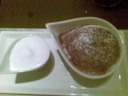 Concludiamo la cena con due diversi tipi di dolci visto che dal menù si poteva decidere di cambiare solo il dolce; servono a me un flan al cioccolato fondente e crema dolce…..