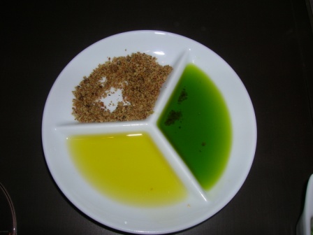 Prima di cominciare, al nostro tavolo viene portato un piattino suddiviso in tre parti con olio extra vergine d’oliva barcelloneta, olio extra vergine di olive alle erbe e un mix di spezie miste,