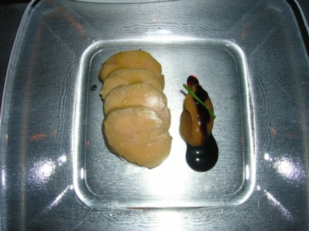 Fois gra d’oca con crema di cipolla ricoperta da ristretto di aceto balsamico ed erba cipollina….a primo impatto sembra spoglio come piatto ma, appena gusto la prima forchettata è un emozione di sapori e l’accompagnamento veramente indicato…..