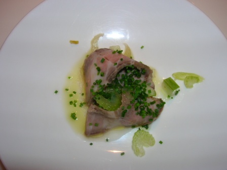 Una fettina di carne sbollentata, accompagnata da sedano, mele Golden ed erba cipollina tagliata finemente, tutto ricoperto da un filo d’olio delicatissimo…