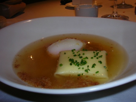 Nell’altro, viene servito un brodino vegetale, accompagnato da uovo leggermente bollito come, un raviolo fresco con ripieno di carne, ricoperto da una spolverata di mollica abbrustolita e erba cipollina….