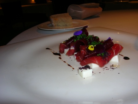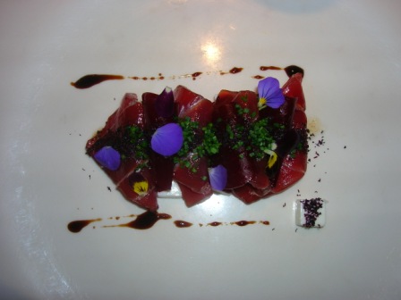 Successivamente viene servito un piatto con filetti di tonno crudo, su di un letto di quadratini di formaggio fresco, ricoperti da petali di fiori, erba cipollina e cacao…
