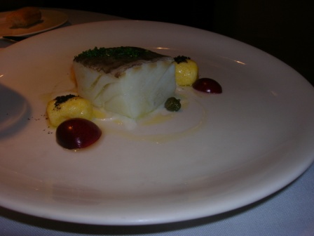 Per l’altro menù, viene servito un trancio di baccalà al vapore accompagnato da palline di polenta, susine e capperi….