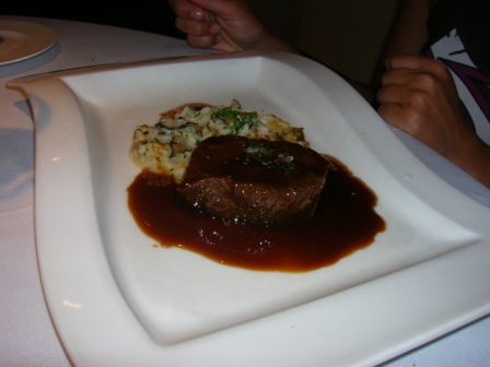 Per il menù più semplice viene servito un filetto di vitello ricoperto da una salsa alla cipolla dolce accompagnata da un risotto al tartufo…grazioso l’abbinamento e piacevoli i sapori in bocca…