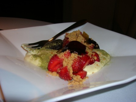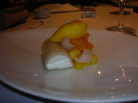 Siamo quasi alla fine e infatti dopo una pausa smoking ci portano il primo dolce, gelato alla vaniglia con frutta fresca, una spolverata di biscotti macinati e pistacchio in polvere…ci voleva proprio!!!!! fiu….che freschezza..