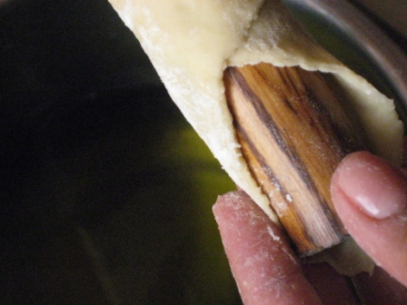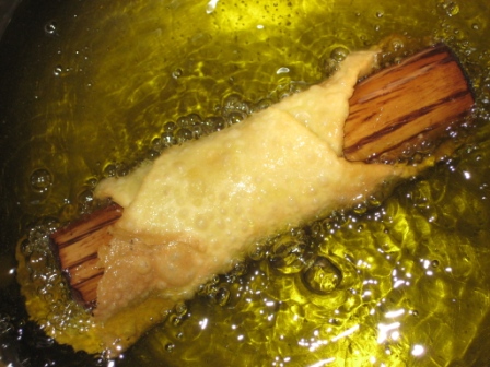 Iniziamo ad immergere i cannoli nell’olio, facendo ben attenzione che restino totalmente sommersi, in modo da avere una cottura uniforme.