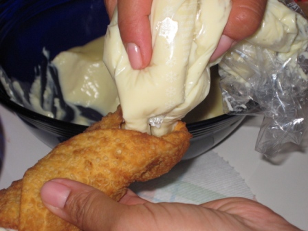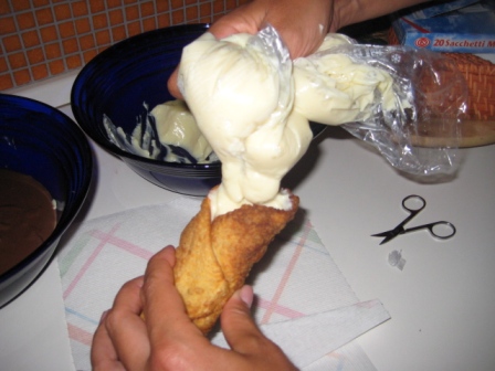 Pronta la crema, ci prepariamo per il riempimento, altra fase cruciale, estraiamo le forme di legno dalle sfoglie e con una “sacca da pasticcere”(un po’ artigianale) inseriamo la crema all’interno della cialda.