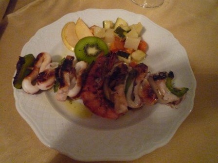 Come secondi, scegliamo un originale spiedino di pesce, con un gamberone al centro e contornato di frutta