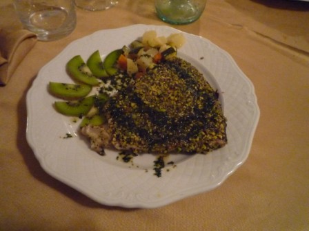 ed una bella fetta di pesce spada, impanato con pistacchio e sempre contornato con frutta.