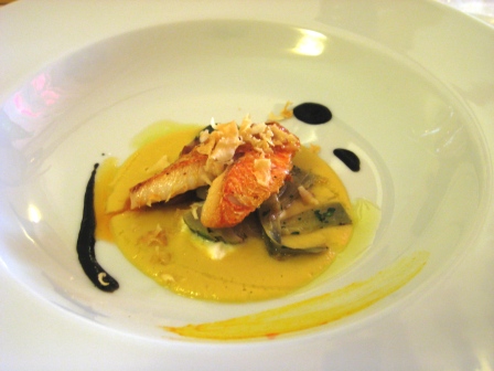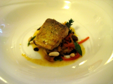 Fegato grasso, con passatina di ceci, ricotta vaccina, carciofi e triglie, finite con mosto cotto di nero d’Avola e chips di topinambur…perfetta commistione di tipicita’ ed innovazione, semplicita’ ed eleganza, per un puzzle di sapori che al palato arrivano con perfetto equilibrio.