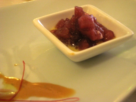 puo’ sembrare una preparazione banale ma….quando l’ottima materia prima, e’ accompagnata da qualche piccolo intervento da parte dello chef….ecco che il risultato diventa fantastico…e cosi’ che la tartare di tonno si fa accompagnare dal succo di insalata d’arance,