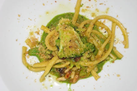 Maccheroncini artigianali con broccoli “arriminati” e Pecorino, salsa al basilico e mollica “atturrata”; anche in questo caso l’esaltazione della semplicita’ in cucina, diventa in bocca un immenso piacere.