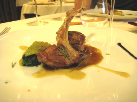 Agnello cotto al carbone con passatina di cicerchie e tortino di bietole e Piacentino Ennese, anche in questo caso, ineccepibile la preparazione, perfetta cottura dell’agnello ed ottimo abbinamento con verdure e Piacentino.