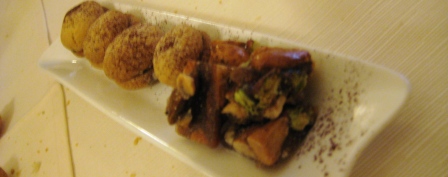 Tortino al pistacchio di Bronte con cioccolato e gelato artigianale al torrone, di sicuro il piatto meno entusiasmante, seppur di ottima fattura tecnica; ma consoliamo subito la piccola delusione con una carrellata di squisitezze che ci vengono servite per concludere dolcemente il nostro pranzo: