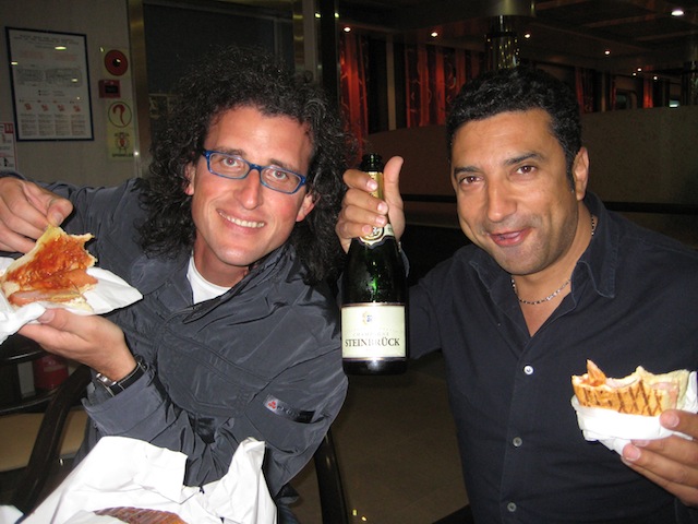 E’ da poco scoccata la mezzanotte ed ovviamente siamo in ritardo, la nave partira’ all’una e noi giriamo per Messina, alla ricerca di qualcosa da mangiare, da abbinare allo champagne che ha portato Pietro, ma non riusciamo a trovare niente di meglio di qualche panino con il wurstel cosparso di maionese e senape…certo per iniziare una kermesse gastronomica mi aspettavo qualcosa di diverso , ma intanto ci si accontenta.