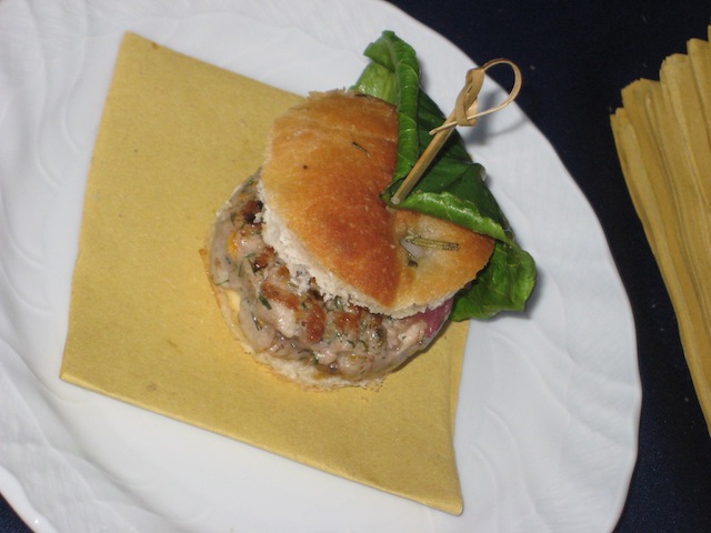 Ed ecco uno dei primi piatti che assaggiamo, quello di Accursio Crapraro della Gazza Ladra di Modica (lo avevamo perso di vista nel corso del pomeriggio, ma eccolo riapparire con la sua interessantissima proposta): Hamburger con pesce crudo dove anche il pane e’ fatto con il pesce….