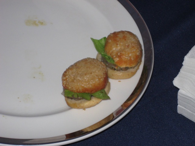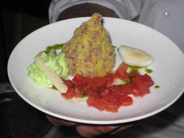 proseguiamo con l’ottimo Fish & Chips di Andreas fatto con il baccala’ ed un intrigante pastella al nero di seppia (che per ingordigia ho mangiato prima ancora di pensare alla fotografia)….e l’arancino scomposto di Vincenzo Candiano, perfetta reinterpretazione innovativa del classico street food Siculo.