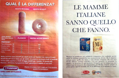 Dall’inizio del mese, su La Repubblica e il Corriere della sera circolano due pubblicità botta e risposta interessanti. Mettendo a confronto il suo classico biscotto per bambini a una Macina del Mulino Bianco, Plasmon accusa la Barilla di non garantire i livelli di sicurezza alimentari dei prodotti consumati da bambini tra gli 0 e 3 anni. Sul livello di due pesticidi NON ammessi nell’alimentazione dei bambini, secondo le norme di legge, i prodotti Barilla risultano NON adatti all’alimentazione dei bambini. Come dire, le norme alimentari dei “grandi” non corrispondo a quelle dei “piccoli” quindi nel biberon ricordati che Plasmon è meglio del Mulino Bianco.