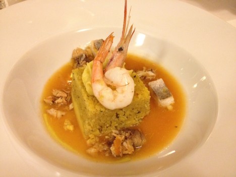 Il “Frappato 2010” è stato proposto con «Frascatole allo zafferano con ceci, salsa araba e brodino di merluzzo». Vi starete chiedendo: di che si tratta?? Le frascatole sono fatte con semola di grano duro e seguono lo stesso principio di lavorazione del cuscus. Nascono da una frettolosa “incocciatura” della semola; in altre parole si tratta dei cocci più grossolani del cuscus “incocciato” male che tradizionalmente venivano scartati, asciugati e cucinati in brodo di verdure. (Non lo sapevo nemmeno io ma mi sono documentato; eccovi l’indirizzo per maggiori informazioni http://www.cucinatrapanese.com/2011/03/frascatole-in-brodo-daragosta.html).