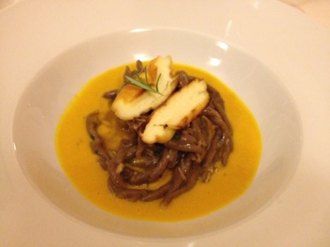 Ancor più interessanti le «Casarecce al carrubo, con stufato leggero di coniglio, crema di carota e ricotta al forno». Il piatto si apprezzava al meglio combinando tutti gli elementi che lo componevano e il risultato era un perfetto bilanciamento di elementi dolci e di sapidità; davvero notevole.